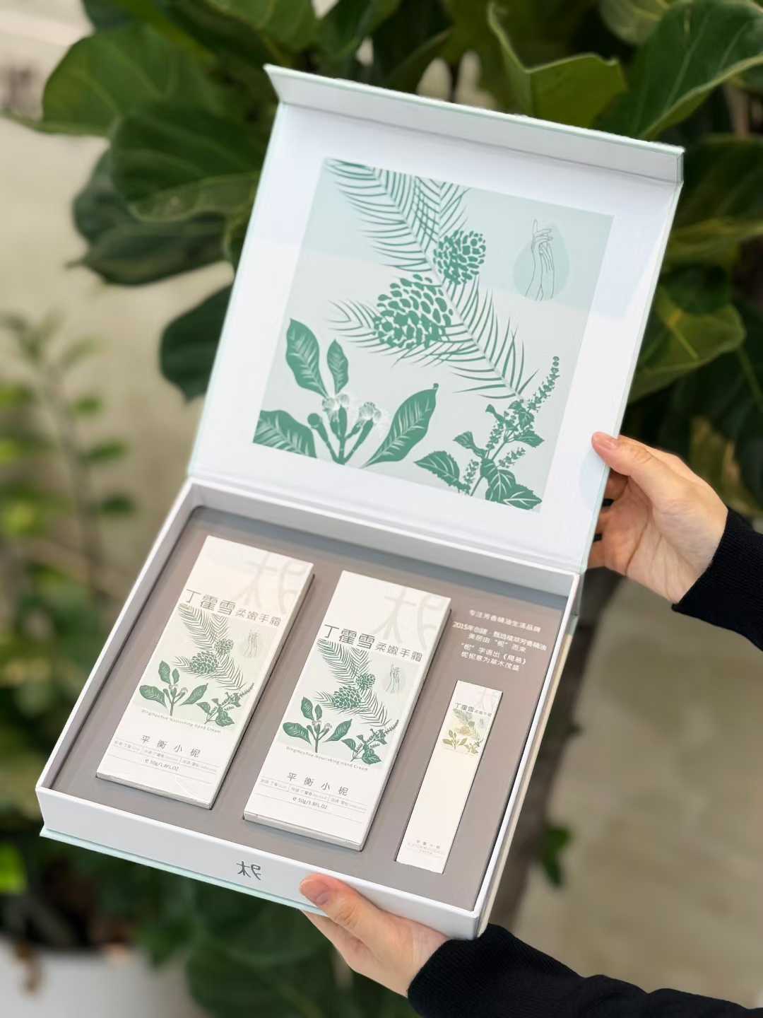礼盒外观以清新草木绿为主色调,搭配植物版画风格的丁香、雪松图案,将自然生机凝于盒身,从视觉上就传递出 “天然、治愈” 的产品调性。打开礼盒,两支护手霜 + 一支同系列润唇膏(或护手霜小样)的组合,满足手部、唇部(或多场景护手)的秋冬护理需求,实用性拉满。
