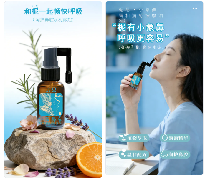 专为鼻干鼻痒、鼻塞反复、鼻腔敏感等鼻腔问题打造的植萃护理油,原创小象鼻设计贴合鼻腔,4+12 种天然精油科学复配,从根源润护鼻腔,让换季、鼻腔不适人群轻松找回顺畅呼吸。