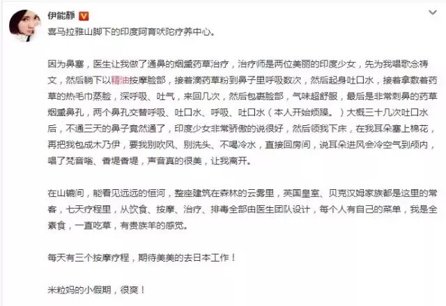 辣妈伊能静也是自然疗法的热衷者,还专门去往印度的阿育吠陀疗养中心进行身心疗愈。