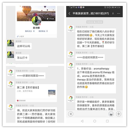 晚上20:00到21:00群内互动讨论学习,例如阅读心得、知识点归纳、总结、分析各种健康问题以及对应的精油养护,学员根据群里的内容安排学习即可。