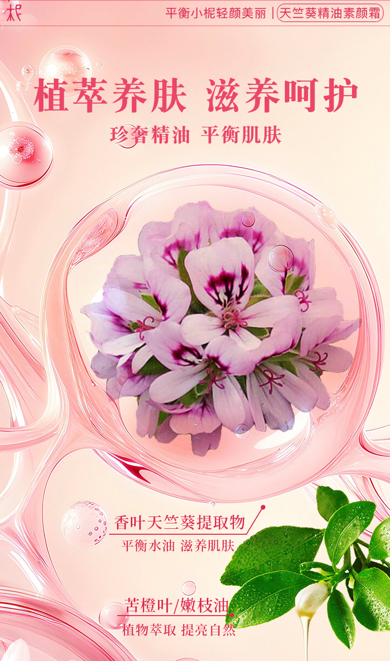 精油的养肤力:添加了天竺葵精油,每次推开都能闻到淡淡的植物香气,很治愈。精油的渗透力让它不像普通素颜霜那样浮于表面,而是带着滋润感被皮肤 “吃进去”,后续上妆也不会卡粉。