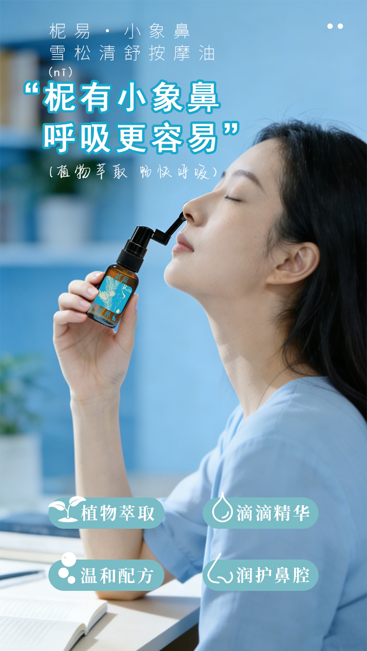 专为鼻干鼻痒、鼻塞反复、鼻腔敏感等鼻腔问题打造的植萃护理油,原创小象鼻设计贴合鼻腔,4+12 种天然精油科学复配,从根源润护鼻腔,让换季、鼻腔不适人群轻松找回顺畅呼吸。